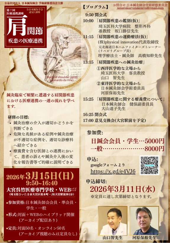 令和8年3月15日(日)、公益社団法人 日本鍼灸師会 学術・研修委員会主催による「第7回 医療連携講座」が大宮呉竹医療専門学校にて開催されました。