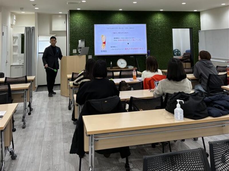 日本セラピー株式会社様の乾翔太先生※による「身体をつながりでとらえるという考え方‘-柔整と鍼灸から学ぶ身体感」というテーマで座学と実技を交えた内容で解剖学と経穴について、講演していただきました。