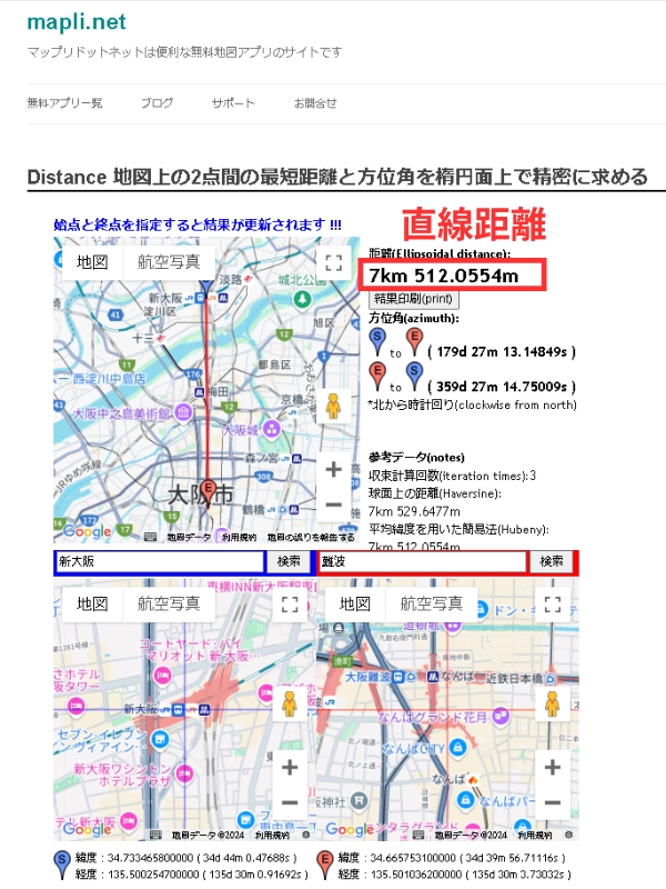 住所もしくはマップ上に直接タッチ選択をすることで、直線距離を出してくれます。