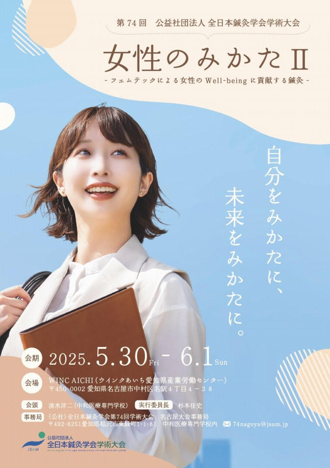 第74回大会は、女性の働きやすさ、女性の活きやすさ等を現在の国策として掲げられている「健康経営」、「フェムテック」を軸にして、鍼灸が女性のWell-bingに如何に貢献できるかを追求する大会にしたいと考えられています。。