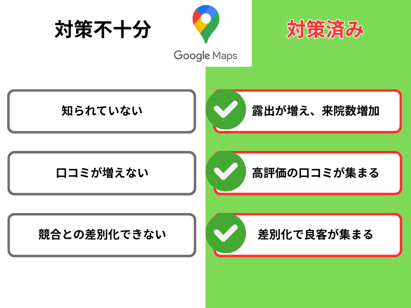 さらに、営業時間・電話番号・口コミなどの情報が一覧で表示されるため、事前に安心感を持って来院を検討してもらえることも期待できます。
