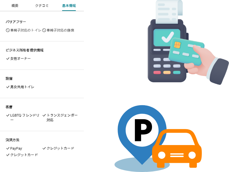 Googleビジネスプロフィールの「詳細」欄では、支払い方法、駐車場、バリアフリー対応の有無などを登録できます。